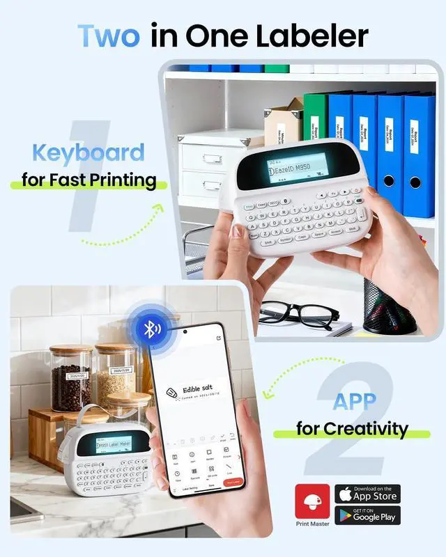 Two Printing Modes : Unlike traditional label makers, EazeID M950 portable label printer supports both QWERTY keyboard printing and Bluetooth connect to the "Print Master" app and gain free access to a vast library of customizable label templates. The app supports over 1000 patterns, 100+ frames, 100+ fonts, barcodes, and QR codes