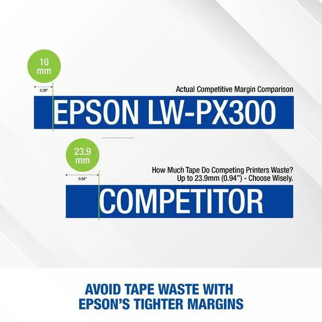 COMPLETE KIT This office-ready label maker kit includes everything needed for professional labeling: an AC adapter, a protective drop guard printer cover, a cartridge of 212VTBWPX standard industrial tape, a user manual, and a durable black carrying case to keep all components organized and secure. Start labeling immediately! ^^ WORKPLACE APPLICATIONS Designed for business environments, the LW-PX300 is ideal for creating custom barcodes, wire labels, and general office identification labels. Its precise and durable print quality makes it perfect for everyday office use or business operations. ^^ PRINT PREVIEW SCREEN This portable label maker includes a large, clear print preview screen, allowing users to view labels before printing. It saves time and minimizes errors, making it ideal for fast-paced office settings. ^^ USER-FRIENDLY The LW-PX300 is highly customizable, allowing users to create labels for better organization and efficiency in the office. It supports a range of label widths, from small sizes up to 3/4" (18mm) and shrink tube up to 3/16" (5mm), compatible with Epson LABELWORKS PX tapes such as 212BWPX, 203YLBWPX, and 205STBWPX. ^^ LIFETIME WARRANTY Epson LABELWORKS label makers have an unmatched full-service lifetime warranty. Whether used in the office, data center or on-site, if the label maker breaks, we replace itno questions asked.