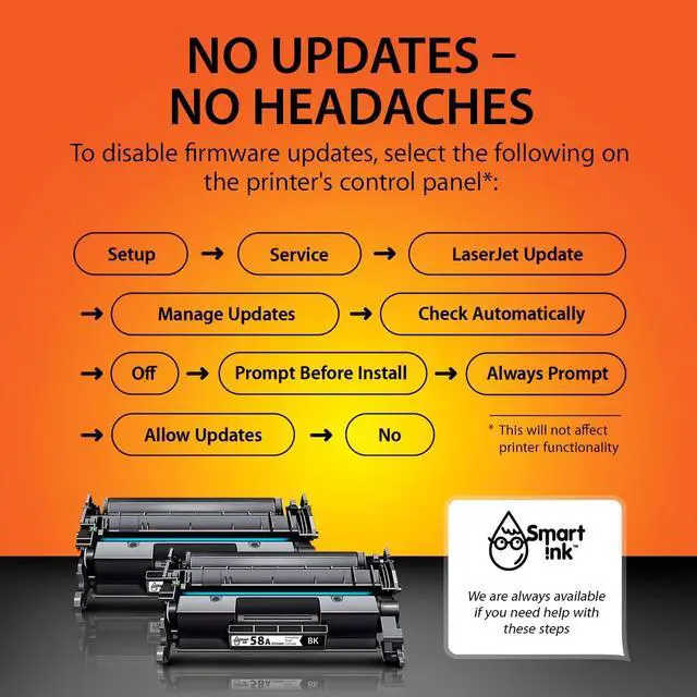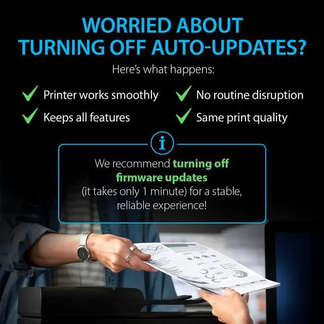 No headaches: Printer auto-updates may interrupt your printing with compatible cartridges when most needed; we recommend turning off the auto-updates to avoid unpleasant surprises (read the instructions in the photo slides)