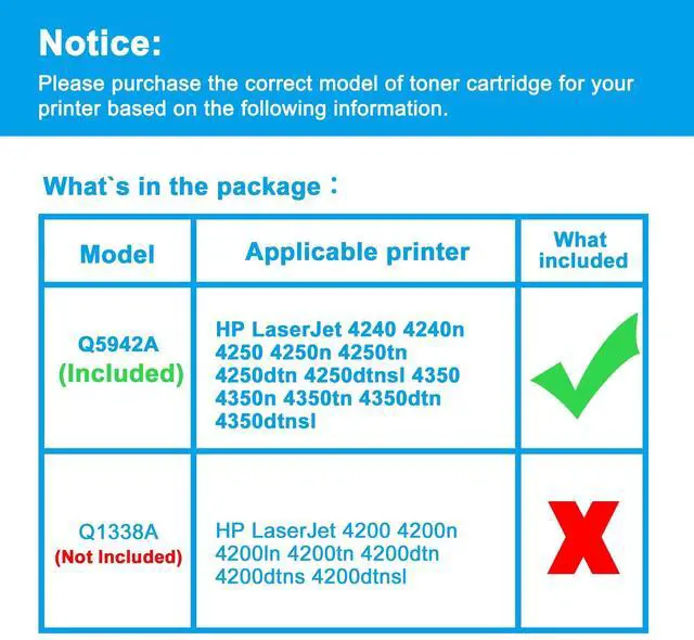 Reliable Quality: LCL Q5942A cartridge uses high quality toner, toner particle size distribution, good mobility, high transfer rate, resulting in a clear image and high gloss print effect; Printing efficiency is high, waste powder rate is low, so as to ensure sufficient page yield.