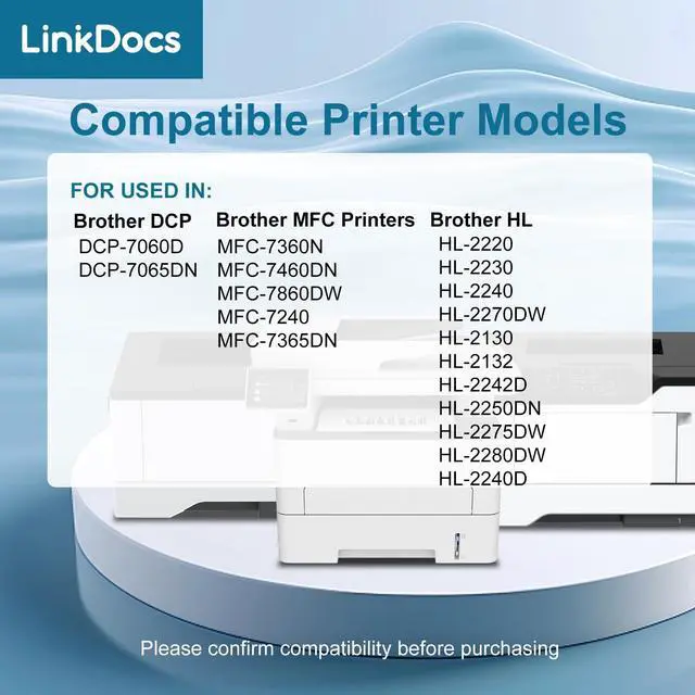 Brother Printers: DCP-7060D DCP-7065DN, HL-2220 HL-2230 HL-2240 HL-2270DW HL-2130 HL-2132 HL-2242D HL-2250DN HL-2275DW HL-2280DW HL-2240D, MFC-7360N MFC-7460DN MFC-7860DW MFC-7240 MFC-7365DN ^^ Compatible with Brother