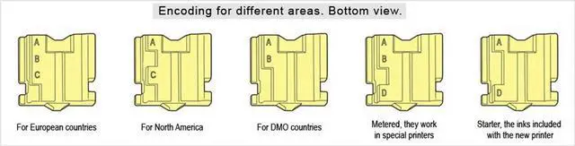select: Information -> Information Pages -> Supplies Usage Page. If you have numbers 936-940, you are coded for European ink. 941-945 is Asia/Pacific, and 946-949 is Metered. My inks will NOT work on units coded for NON-North American regions. If you have A-D coded cubes and/or have ONLY ever used the Starter Pack, you should have no issues with these, as the printer will code automatically based on the first retail ink you put in.