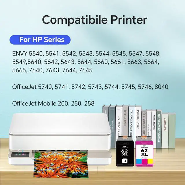 Compatible Printers: 62XL ink cartridge combo pack Compatible with HP ENVY 5540, 5541, 5542, 5543, 5544, 5545, 5547, 5548, 5549, 5640, 5642, 5643, 5644, 5660, 5661, 5663, 5664, 5665, 7640, 7643, 7644, 7645; OfficeJet 5740, 5741, 5742, 5743, 5744, 5745, 5746, 8040; OfficeJet Mobile 200, 250, 258 printer ^^