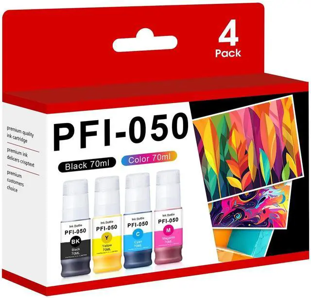 Package Contents: This package includes 1 replacement bottles for Canon PFI-050 black ink, 1 bottle each for Canon PFI-050 cyan, magenta, and yellow inks. Please note that these are non-OEM inks ^^