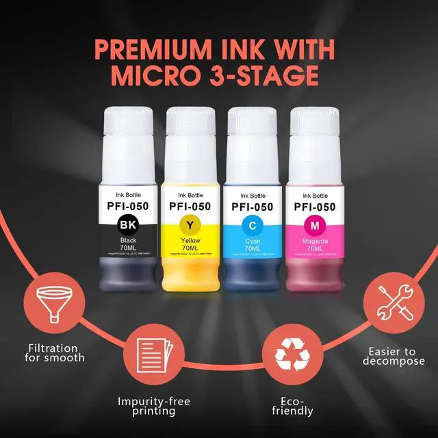 Ink Capacity: The refill bottles contain 70ML of ink each, including PFI-050 BK Pigment Ink, PFI-050 C Cyan Pigment Ink, PFI-050 M Magenta Pigment Ink, and PFI-050 Y Yellow Pigment Ink ^^