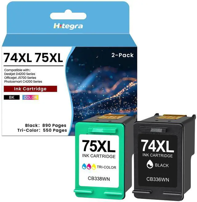 Remanufactured 74 75 Ink Cartridge - 74XL 75XL ink cartridge with 2 pack (Black / CB336WN, Tri-Color / CB338WN), upgraded materials and chip bring the perfect printing experience ^^ High Capacity Yield Pages - Deskjet D4260 ink cartridge up to 890 pages for each black 74XL ink cartridge, up to 550 pages for each tri-color 75XL ink cartridge, based on 5% coverage of A4/Letter ^^ Compatible with Printers - 74 75 ink cartridge replacement for HP Deskjet D4260 D4263 D4268 D4280 D4360 D4363 D4368 Officejet J5725 J5730 J5735 J5738 J5740 J5750 J5780 J5783 J5785 J5788 J5790 J6405 J6410 J6413 J6415 J6424 J6450 J6480 J6488 printers ^^ Compatible with Printers - 74XL 75XL ink cartridges replacement for HP Photosmart C4200 C4205 C4210 C4225 C4235 C4240 C4250 C4270 C4272 C4273 C4275 C4280 C4283 C4285 C4288 C4293 C4294 C4300 C4340 C4342 C4343 C4344 C4345 C4348 C4380 C4382 C4383 C4384 C4385 C4400 C4410 C4424 C4435 C4440 C4450 C4470 C4472 C4473 C4475 C4480 C4483 C4485 C4488 C4493 C4494 C4500 C4524 C4540 C4550 C4575 C4580 C4583 C4585 C4588 C4599 C5200 C5225 C5240 C5250 C5270 C5273 C5275 C5280 C5283 C5288 C5290 C5293 C5500 C5540 C5550 C5580 D5300 D5345 D5360 D5363 D5368 printers ^^ CB336WN CB338WN Ink for Hitegra - Officejet J5740 ink can automatically recognize the printer, and press determine key according to the reminder after connecting the printer.