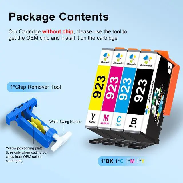 TIP: Due to the different cartridge sizes, it is not compatible with HP 923e/924e/925e high capacity cartridges. ^^ No Chips923 ink cartridges replacement for HP 923 ink do not include the chips, you will need to follow our video tutorial or illustrated tutorial to install the original chip (We don't provide chips) on top of the compatible cartridge using the supplied tool. Using a tool, remove the original chip and remove the excess from the chip; Peel off the tape of the new compatible cartridge and install the original chip. ^^ Package Contents923 ink cartridges (NO