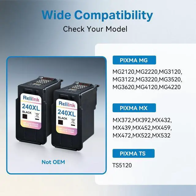 ^^ Wide Printer Compatibility: ReliInk 240 ink cartridges for canon printers are designed to work flawlessly with a broad range of canon pixma printer, including Pixma MG3620, TS5120, MG2120, MG2220, MG3120, MG3122, MG3220, MG3520, MG4120, MG4220, MX372, MX392, MX432, MX439, MX452, MX459, MX472, MX522, MX532. Whether youre printing at home, in a small business, or for school projects, this for mg3620 canon printer ink deliver consistent quality and smooth operation with zero compatibility worries.
