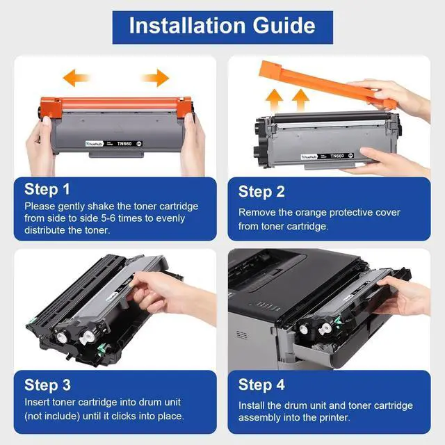 Package Contents: 2 x Black TN-660 Toner Cartridge, (Not included drum unit, Please noted that TN660 toners need to be combined with DR630 drum unit to use) ^^