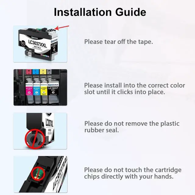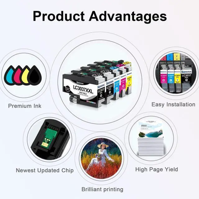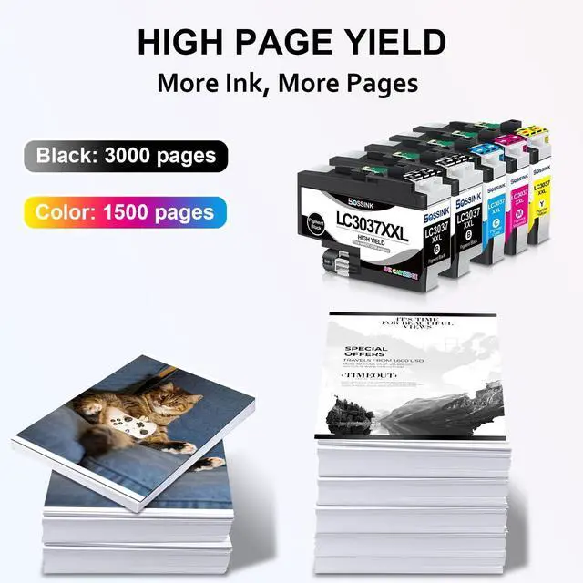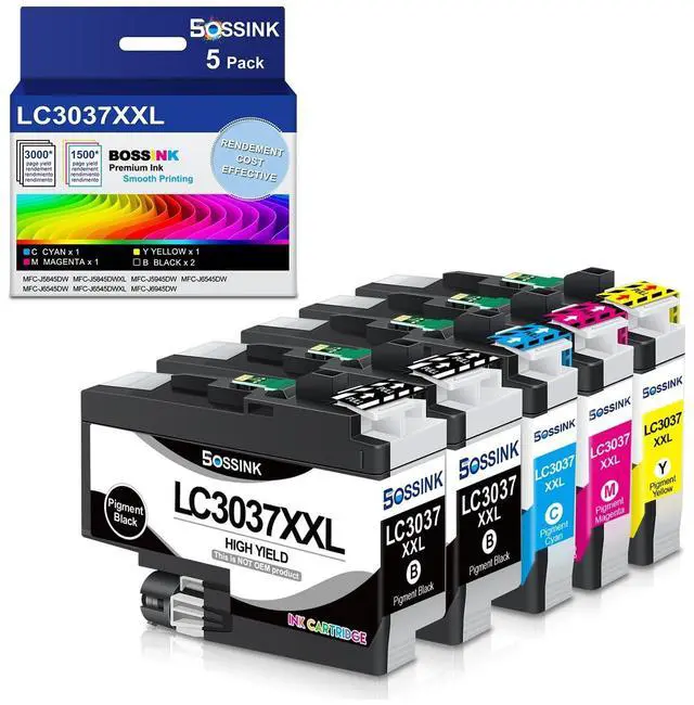 High-QualityBOSSINK lc3037xxl ink cartridge is equipped with the latest smart chip, which undergoes strict quality control to ensure fast and easy installation and instant recognition. BOSSINK LC3037 xxl ink cartridges are an ideal replacement for Brother LC3037 bk/c/m/y ink cartridge. ^^ High CompatibilityCompatible with Brother MFC-J5845DW MFC-J5845DWXL MFC-J5945DW MFC-J6545DW MFC-J6545DW MFC-J6545DWXL MFC-J6945DW Printer. ^^ Premium Ink Output Up to 3, 000 pages per lc3037xxl black ink and up to 1, 500 pages per lc3037xxl color ink cartridge (at 5% coverage on A4 paper). BOSSINK lc3037xxl ink delivers smooth printing with vibrant color output, serving as a seamless replacement lc3037 bk/c/m/y ink cartridges for Brother.