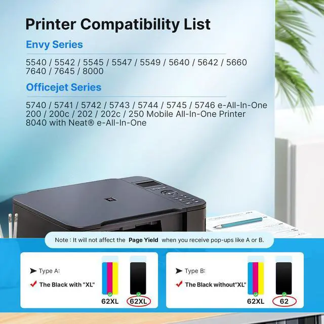 Package Contents: 2 x 62xl ink catridges black, 1 x User Guide ^^ Compatible for HP OfficeJet Mobile 200 250 ^^ Compatible for HP OfficeJet 8040 5040 5540 5542 5545 5547 5549 5640 5642 5660 7640 7645 Printer ^^ Compatible for HP ENVY 5540 5660 7640 5643 7643 5542 5545 5547 5549 5640 5642 7645 8000 printer ^^