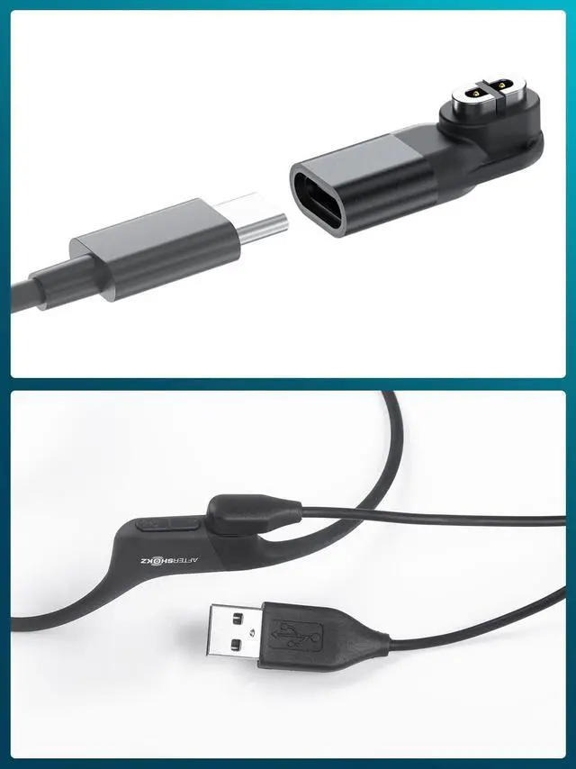 Compatible with AfterShokz Aeropex, Shokz OpenRun, Shokz OpenComm, Shokz OpenRun Pro, and Shokz OpenRun mini. Connecting it with a USB C cable allows you to charge your aftershock headphones (USB C cable not included). For Shokz charging cable ^^ Contain 2 USB C adapter and 2 USB charging cable, a compact and lightweight design for Shokz OpenRun Pro charging cable. Enables versatile placement options, more options from your power source to your Aftershokz Headphones charger. ^^ Connect power to an adapter, or computer with a USB-C cable. USB charging cable is convenient for charging from a wall outlet or computer that supports 5V power delivery for Aftershokz bone conduction headphones.