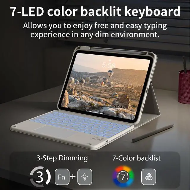 Inch 2022 (Models: A2696/A2757/A2777). Verify your iPads model number before purchase to ensure perfect fit. ^^ Multi-Touch Trackpad & Gesture Control The built-in precision trackpad supports multi-finger gestures (tap, swipe, scroll, app switching), allowing you to click, scroll and swipe content with ease for a comfortable user experience. It transforms your tablet into a laptop, enhancing productivity for web browsing, document editing, and creative work. ^^ Detachable Magnetic Keyboard with 7-Color Backlight Features a wireless Bluetooth keyboard with magnetic attachment/detachment functionality. Customizable 7-color RGB backlight with 3 brightness levels enables comfortable typing in low-light environments. You can choose your favorite color, bringing you different visual enjoyment. Ergonomic and mechanical scissor keys with rebound feature to reduce noise, enjoy comfortable typing even long hours ^^ Flip Stand with Three Viewing Angles & Built-in Pencil Storage The thin and light protective case features a flip stand with three adjustable viewing angles and a built-in right-side Apple Pencil holder, tip cover and adapter slot for easy access and portability. Precise cutouts provide full access to all ports, sensors, speakers, microphone and camera. Ideal for drawing, note-taking or watching videos, perfect for home, office or study use.