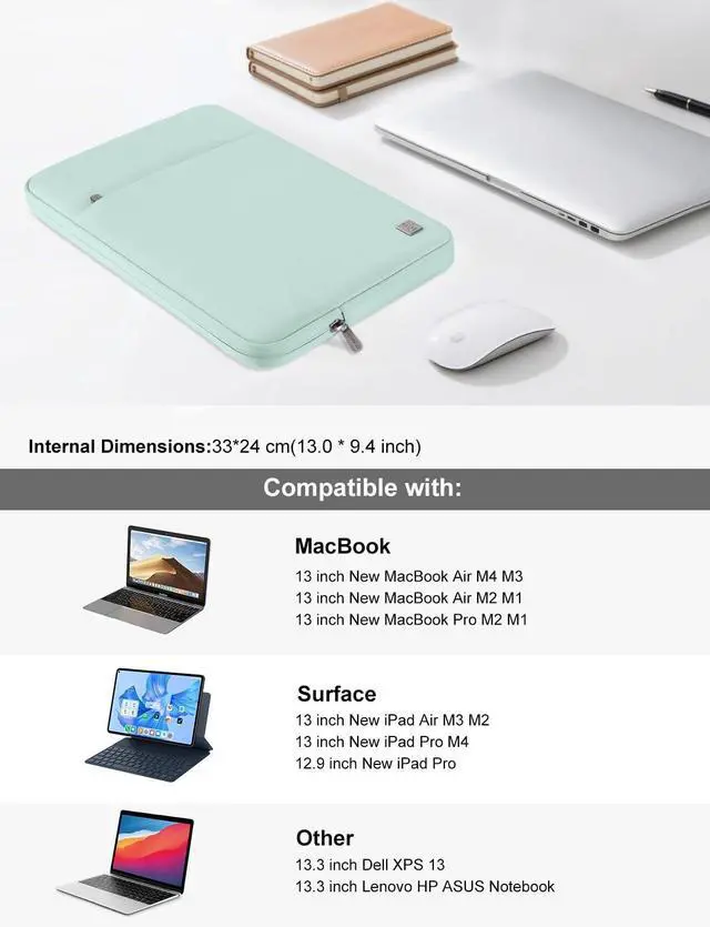 • INTERNAL DIMENSIONS: 13.2*9.6*1.0 inches; Perfectly fits 13-inch New MacBook Air M4/A3240 2025, M3/A3113, M2/A2681, M1/A2337, A2179, A1932 2024-2018, 13 inch MacBook Pro M2/A2686, M1/A2338, A2251, A2289, A2159, A1989, A1706, A1708 2024-2016/13 inch New iPad Air M3 M2/13 inch New iPad Pro M4/12.9 inch New iPad Pro 6th 5th 4th 3rd.Also compatible with 13-inch Surface Pro 11(Copilot+PC)/10/9/8/X with Surface Pro Flex Keyboard;Dell XPS 13 Ultrabook,and most 13 inch laptops notebook from Dell, Acer, Lenovo, HP, Asus.