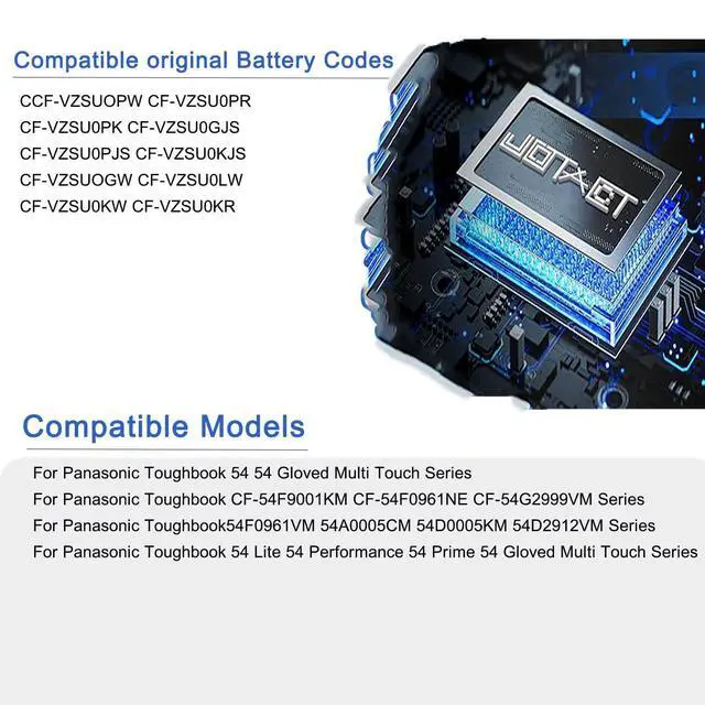 Battery Life: Up to 500 recharge cycles over the life of the battery ^^ Compatible original Battery CodesCF-VZSUOPW CF-VZSU0PR CF-VZSU0PK CF-VZSU0GJS CF-VZSU0PJS CF-VZSU0KJS CF-VZSUOGW CF-VZSU0LW CF-VZSU0KW CF-VZSU0KR ^^ Compatible Laptop ModelsFit for Panasonic Toughbook 54 54 Gloved Multi Touch 54 Lite 54 Performance 54 Prime 54 Gloved Multi Touch CF-54F9001KM CF-54F0961NE CF-54G2999VM 54F0961VM 54A0005CM 54D0005KM 54D2912VM Series ^^ High Safety 100% New, 100% Compatibility. Over-current protection, over-voltage protection, over-temperature protection, short-circuit protection, reserve protection, antistatic impact. Certified by CE/FCC/ROHS/UKCA