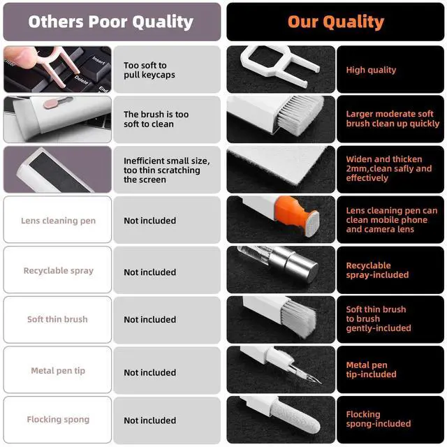 DEEP CLEAN YOUR DEVICE The electronics cleaner kit can effectively deep clean all your electronic devices such as mobile phones, tablets, TVs, etc. It comes with retractable large keyboard brush, polishing cleaning cloth X 2, keycap puller, metal pen tip, flocking sponge, thin soft brush, soft plastic lens cleaning pen, 5 replacing cloth, large cleaning microfiber cloth. It's compact so you can keep one in a drawer, one in the car or in your bag