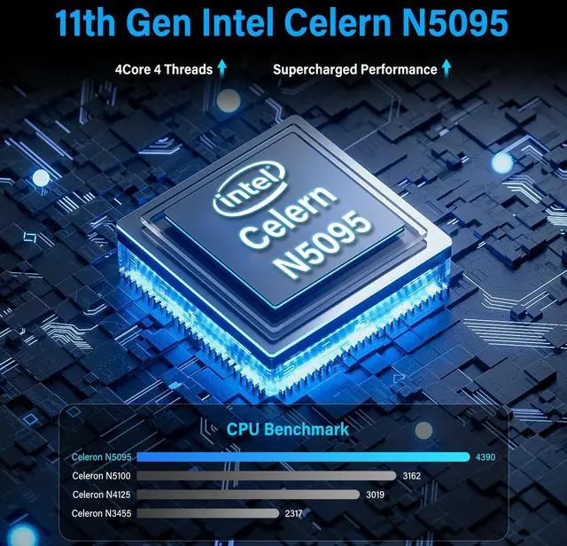 supports Win 10, Support IOT buildingIdeal for developers and programmers running dual custom OS. Extra large memory 8GB DDR4, 128GB Upgrade 256GB EmmcUPGRADE 3. ^^ Celeron N5095 CPUThis small mini PC, features the Faster Celeron N5095 processorUPGRADE 4, J4125 Upgrade N5095 with CPU/GPU throttling. It's a competent quad-core that does a decent job for lightweight tasks, with a base operating frequency of 2.0 GHz/s to 2.9GH z (4MB cache). Drawing under 10 watts of power. Its metal body helps to expel heat quickly and the device is completely silent, improving efficiency.