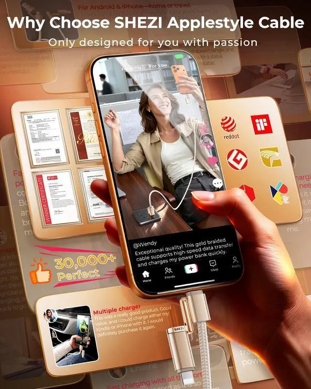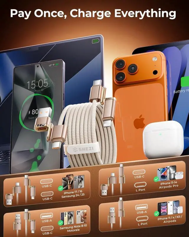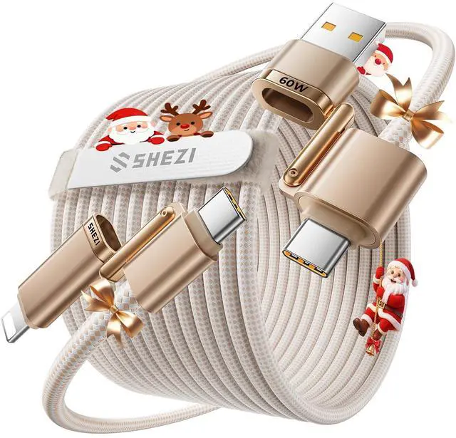 Simplicity: SHEZI is the first to launch the new Applestyle Series of 4-in-1 charger cable for devices with USB A to Lightning, USB A to Type C, Type C to Lightning, and Type C to Type C ports. One cable for all your needs. Designed with compactness and practicality in mind, it combines the minimalist look of Applestyle with 4-in-1 ports, bringing you a distinctive, minimalist and luxurious shopping experience ^^ 60W Fast Charging - Say Goodbye to