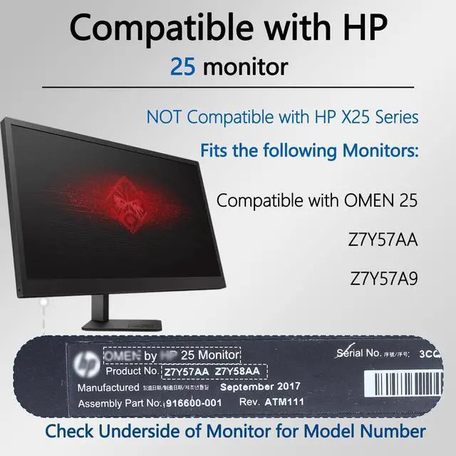 Monitor models: OMEN 25, Z7Y57AA, Z7Y57A9 ^^ NoticeIncompatible with OMEN 25i Gaming Monitor, Incompatible with OMEN X 25, Incompatible with OMEN X 25f, Incompatible with OMEN 27i, Incompatible with OMEN 27, Incompatible with OMEN X27, Incompatible with OMEN 27 (2023), Incompatible with OMEN 27C, Incompatible with OMEN 34C ^^ Universal