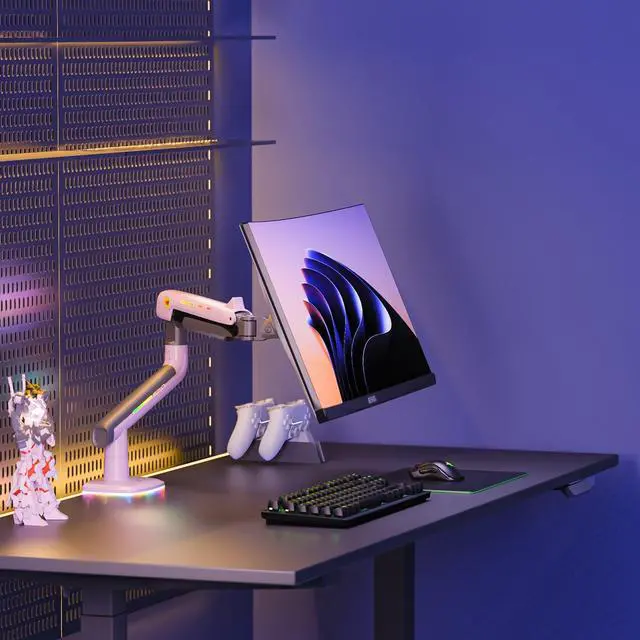2 Way Installation: Double C Clamp or Grommet Hole. ^^ 2. Ready in MinutesNo need to sort through bags of parts unlike other mount products, just clamp in or directly insert into your desk hole in a few steps. Special quick-release head design allows easy ONE person installation. ^^ 3. Built-in RGBSwitch color modes with ONE click, No need to purchase separate light, instantly fill your room with dynamic glow and gaming vibe. ^^ 4. Ergonomics ComfortReduce discomfort from long time gaming or work through new ERGONOMIC design; Freely adjust with 360 rotation, -50 to +50 tilt, -90 to +90 swivel, and up to 25 inches long arm extension. ^^ 5. Enhanced TechnologyPremium Grade aluminum longer years of usage; Mechanical ProSpring Technology easier tension adjustment; Built in cable management cleaner desk; Advanced gear locking system passed 50000 performance cycle tests and 3X overload stress tests.
