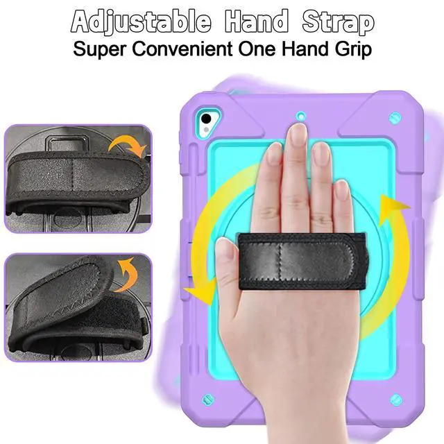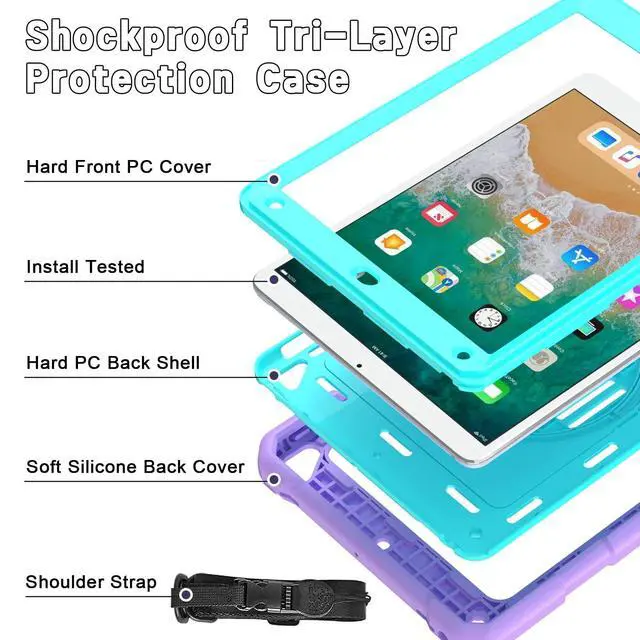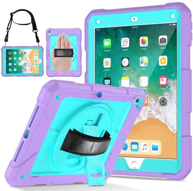 Pro 9.7 inch 2016 (Model: A1673 A1674 A1675) ^^ Super Sturdy - iPad 6th/5th Generation Case 9.7 inch, construct from fine material like silicone rubber and polycarbonate, durable, shock-resistant, gives decent protection for your iPad 6th/5th generation, iPad Air 2 and iPad Pro 9.7" tablet ^^ Great for Grip/Hold - 6th Generation iPad Case 9.7 inch, rugged design, anti-slip surface made it easy to hold, even for little kids, and hand-strap can be easily adjusted according to the size of your hands ^^ Fun and Functional - iPad 6th Generation Cases, colorful, attractive for children, plus it comes with pencil holder, swivel kickstand, hand strap and shoulder strap, allows hands-free viewing in different comfy angles, available on the go ^^ Worth Every Penny - iPad Air 2 case, hang it on the car headrest, set-up the stand in kitchen while cooking, take it to school/gym/picnic/camping/outdoor etc. It can be put to use in many settings, absolutely kid-friendly, great value, decent protection, wonderful gift choice for family and friends