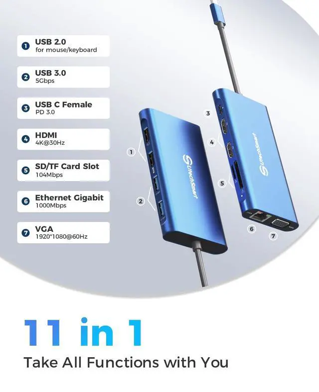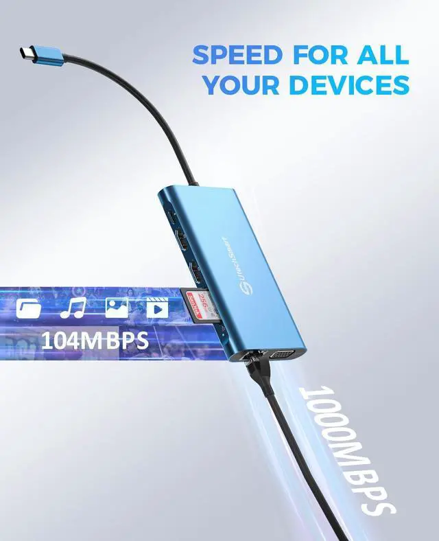 Attention: It doesn't support extend mode for Mac OS (Apple laptop) & Chrome OS. ^^ Ultra-portable & Discreet Powerful Workstation We designed the USB C hub to be slim and compact without any compromise on accessibility. Lighten your load and ditch the extra cable adapters! The slim portable design of the UtechSmart USB C hub equips with USB C PD port, Gigabit RJ45 port, two 4K capable HDMI ports, VGA port, SD/TF card slot, 2x USB 3. 0 and 2x USB 2. 0 Ports. With a simple plug and play connectivity, This USB C hub turns any USB C capable PC laptop into a mobile workstation! ^^ PD 3. 0 (power delivery) Technology & Smart Safety The UtechSmart USB C hub is rated at 87W and supports power Delivery 3. 0 technology which allows significantly shortened charging times when compared to a non-pad charger. This USB C hub is equipped with intelligent microchip which provides a slew of safety features including overload protection, short circuit protection, and temperature protection. With these protection strategies, feel safe when your devices are connected to the USB C hub! ^^ Advanced Networking & Blazing-fast Data Transfers both power users and gamer will appreciate the plug and play instant access to the blazing fast 1000M Ethernet port.