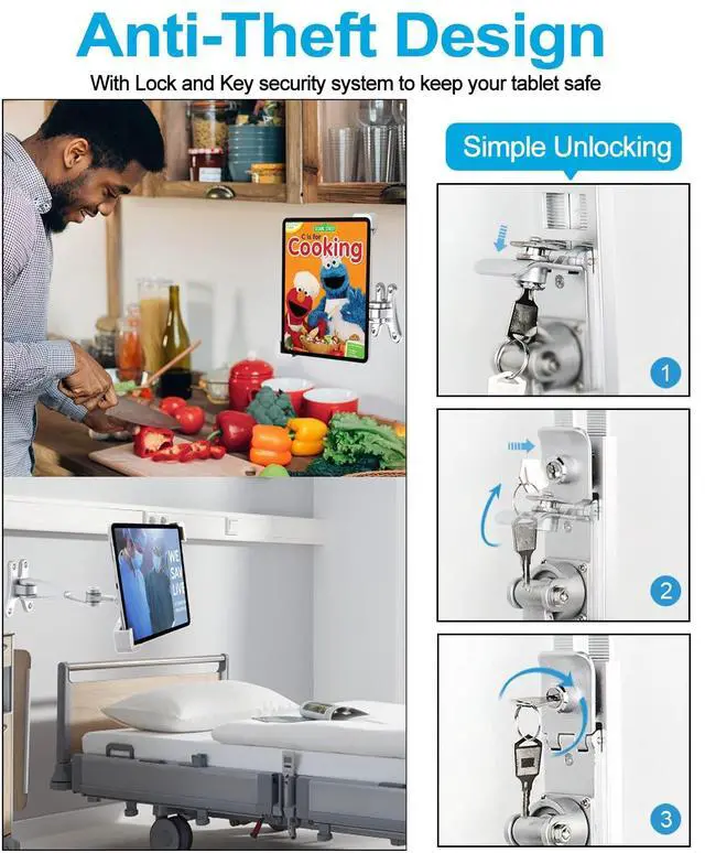 Secure and Anti-ThiefOnce the tablet is put in and locked, it cannot be opened without a key. The whole bracket is made of all-aluminum alloy, which is thick and sturdy. Complete anti-theft function is realized, so you don't have to worry about losing your tablet. ^^ Multi-ple Angle AdjustableThe wall stand tablet mount has three adjustable joints, so that the arms can be adjusted up and down, left and right, and the arms can be folded up when not in use, which will not affect people passing by the wall.