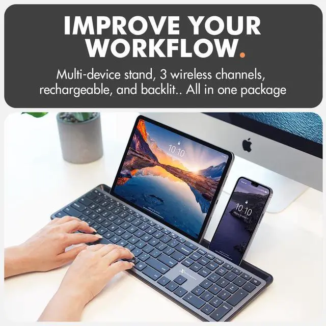 Extra Long Dock): This wireless ipad bluetooth keyboard with phone holder keeps your devices within reach, allowing smooth transitions between your computer, tablet, and mobile devices. The slim keyboard design makes it easy to fit on any desk. ^^ (Fullsize with