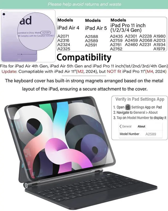 Compatibility: Compatible exclusively with iPad Air 11 inch (2024/2025) & iPad Air 10.9 inch (2020/2022), and iPad Pro 11 inch (2022/2021/2020/2018); models: A2435, A2761, A2759, A2316, A2324, A2325, A2072, A2377, A2459, A2301, A2460, A2068, A2228, A2230, A2231, A1980, A2013, A1934, A1979. Please hlep to avoid returns and waste, kindly verify compatibility by checking at the back of your iPad or navigating to Settings > General > About.