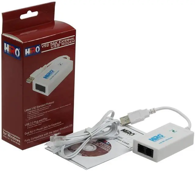 HIRO H50228 V92 56k external USB data fax dial up internet modem is a truly plug and play device. With Windows built in driver, users could simply plug it into any USB 2.0 port and the driver will be automatically installed. It is compatible for use with Windows fax and scan to send and receive fax. It is also suitable for dial up internet connection, compatible with major ISPS including NetZero, AOL, EarthLink, PeoplePC, Verizon, AT&T, etc. It provides dual RJ-11 phone jacks for connecting to an external telephone and/or answering machine.