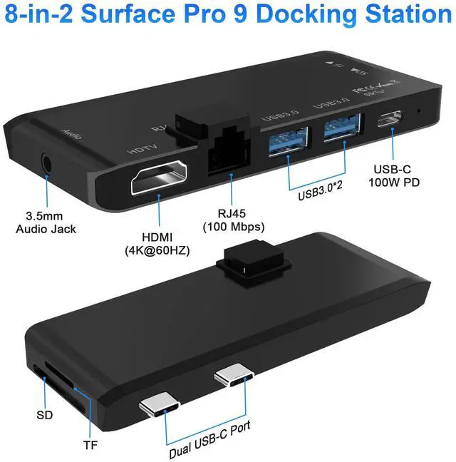 USB-C connection into 8 ports: 4K HDMI port, 100M Ethernet LAN, USB 3.0 *2, 3.5 mm Audio, USB-C(Display+Data+100W PD Charging), SD slot, Micro SD slot. Surface Pro 9 dongle only compatible with Microsoft Surface Pro 11/10/9/X ^^ 4K HDMI adapter for