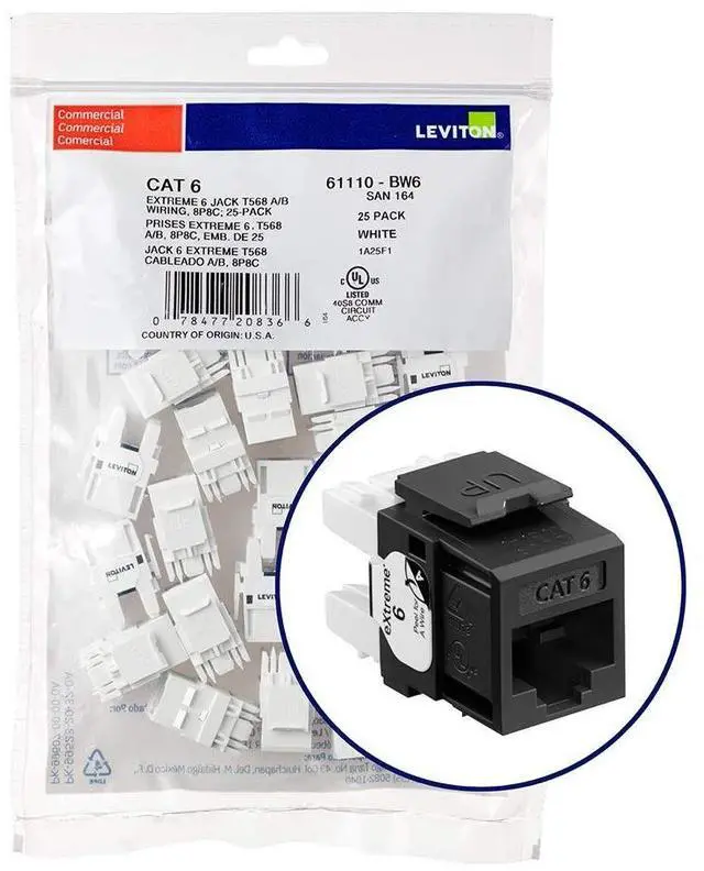 Leviton Extreme 6+ QuickPort Connector, CAT 6, 25-Pack, 61110-BE6, Black