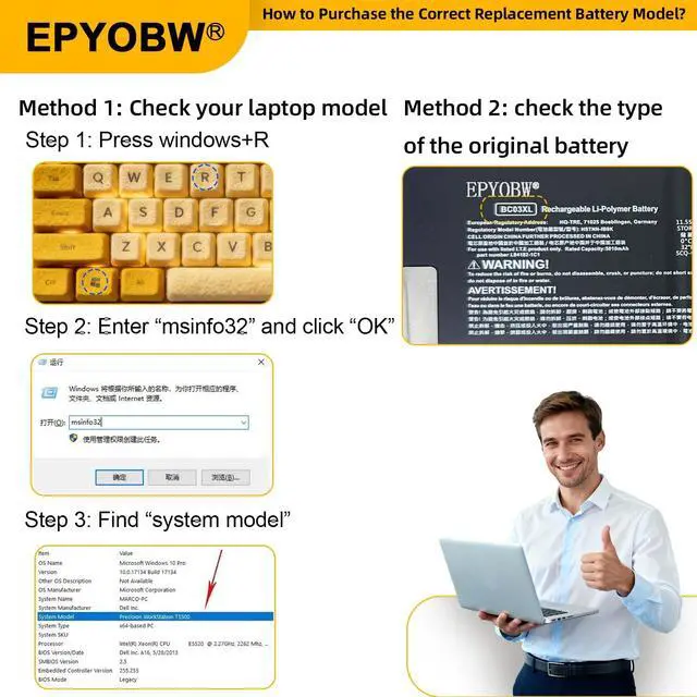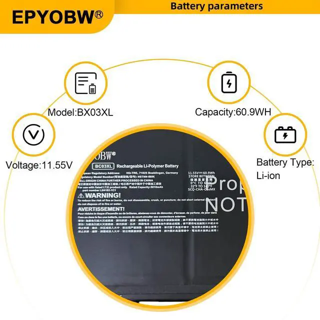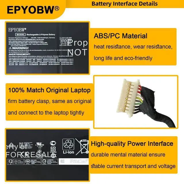 (Note: BC03XL 60.9W h is suitable for Chromebook x360 14C-CA0000, Pro C640 Chromebook and Pro c640 Chromebook Enterprise Series, but not suitable for Pro C640 G2 Chromebook and Pro C645 Chromebook Enterprise Series, you can open the back of the laptop to check the original battery model, please make sure your original battery is the same as the picture before ordering) ^^ Purchase SkillsPlease open the back cover of the laptop before ordering and make sure that the original battery model is consistent with the listing. After getting the battery, please install the battery correctly, make sure that the battery connector is firmly connected to the laptop motherboard, and use the original charger to charge the laptop. Discharge the new battery to 5% (not 0%), then charge and cycle 3-4 times to wake up the new battery. ^^ EPYOBW PromiseAll EPYOBW's batteries are certificated by UL/CE/FCC/RoHS. Our batteries are tested by strict quality control standards to ensure that the capacity is true, stable current, low self-discharge. And we also have short circuit, overheat, and overload protections. We are confident in the performance of replacement batteries and professional service.