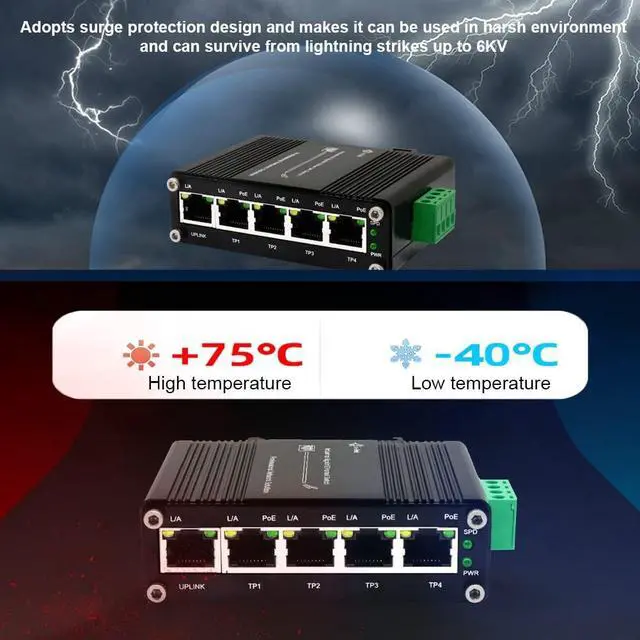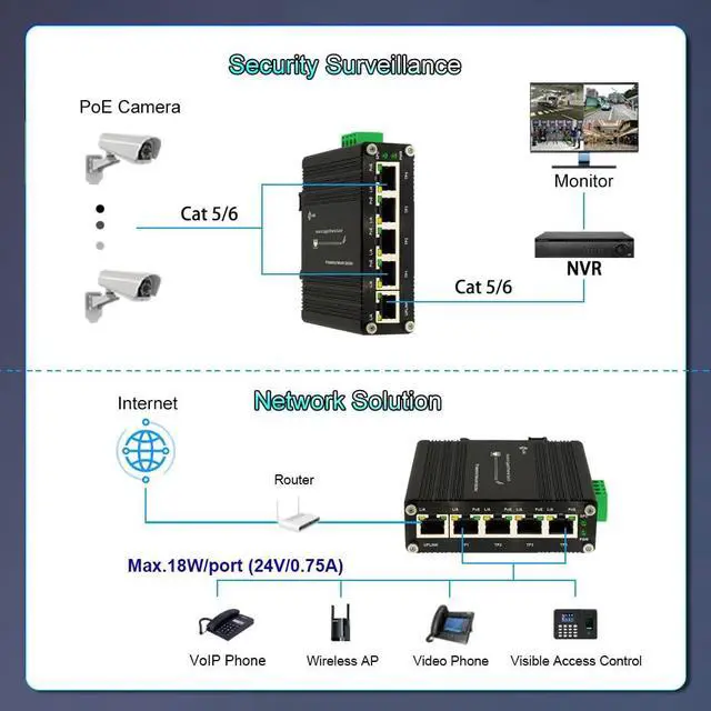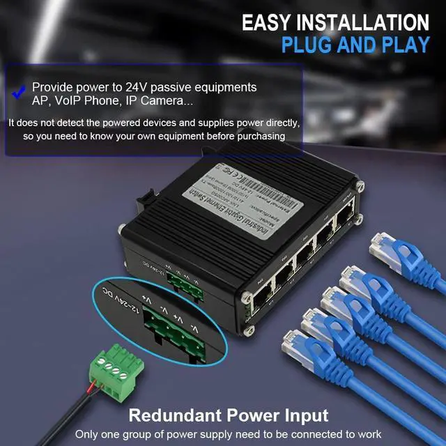 12-24V DC Input- The passive PoE switch supports 12-24V DC input and increases voltage to 24V PoE output. It will solve the problem that you only have 12-24V without 24V centralized power supply. ^^ 10/100/1000Mbps Ethernet The industrial passive 5 ports Ethernet PoE switch has 5 RJ45 ports 10/100/1000Mbps. ^^ 3.74 x 2.76 x 1.18 in Ultra Small - The passive 5 ports Ethernet PoE switch has smaller size than other switches, it only need small space to place it. Convenient and easy to install. ^^ Din-Rail & Wall Mount- The passive gigabit PoE switch come with 35mm din-rail mounting bracket and wall mount accessory.