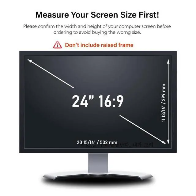 Filter Dimensions: width 20.9" (532 mm), height 11.7" (299 mm) Keep your computer screen private from coworkers and onlookers. Welinc monitor Privacy Screen Filters are compatible with laptops, notebooks, desktops, and all-in-one computers. They are ideal for open office settings, schools, financial institutions, mortgage companies, and medical offices. ^^ Enhanced Privacy Protect your privacy with an Welinc privacy screen filter. Welinc Privacy Protector makes on-screen data visible only to individuals sitting in front of the monitor. Welinc privacy screen filter makes the screen appear dark when looking at it from an angle (the angle is 30 Each - Both 60), but bright when looking directly at it. Welinc monitor screen protector features multiple layers of thick film with revolutionary micro-louver technology. ^^ Perfect Fit with 24 inches Diagonally Measured - Widescreen monitor - Aspect Ratio 16:9 -