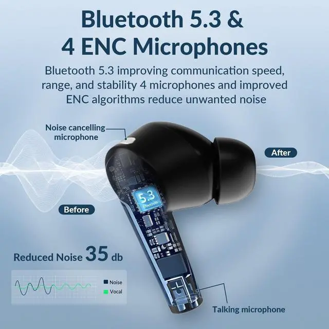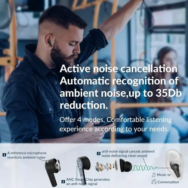 HIFI sound quality & Bluetooth 5.3E njoy HIFI sound quality with advanced Bluetooth 5.3 and 10mm PET+PU composite driver. Wireless headphones support SBC/AAC codec, improving communication speed, range, and stability. Well-balanced sound from deep bass to smooth mid-highs, delivering sound closer to the original. Game mode support 38ms low latency, improving the video viewing and game experience. ^^ Active Nosie CancellingExperience active noise cancellation up to 35dB with four operating modes: 'Noise-cancelling mode', 'outside sound intake mode', 'music mode', and 'game mode'. Both left & right earbuds should be worn at the same time for better noise-cancelling effect. Please select the ear tips that fit you best, including L/M/S size. ^^ 4 ENC MicrophonesEnjoy clear calls with wireless earphones built-in 4 clear call microphones. Wireless earbuds suitable for long calls, useful for work, web conferencing/video conversation/telework. ENC microphone reduces noise up to 95% in noisy environments. Such as restaurants/subways/bars/downtown areas, ensuring a clear voice is transmitted to the other party. ^^ 30 Hours PlaytimeEnjoy up to 30 hours of total listening time with a charging case. When the Active Noise Cancellation is enabled, the Bluetooth earbuds can provide up to 7 hours of listening time and total 30 hours with charging case. Fully recharging the charging case and wireless earbuds only takes 1.5 hours. The unique magnetic design makes the earbuds convenient to store. The earphones automatically power on when the earphone case is opened. ^^ Easy operationEnjoy easy operation with automatic pairing technology. Earbuds will automatically connect to your devices after the first-time pairing.