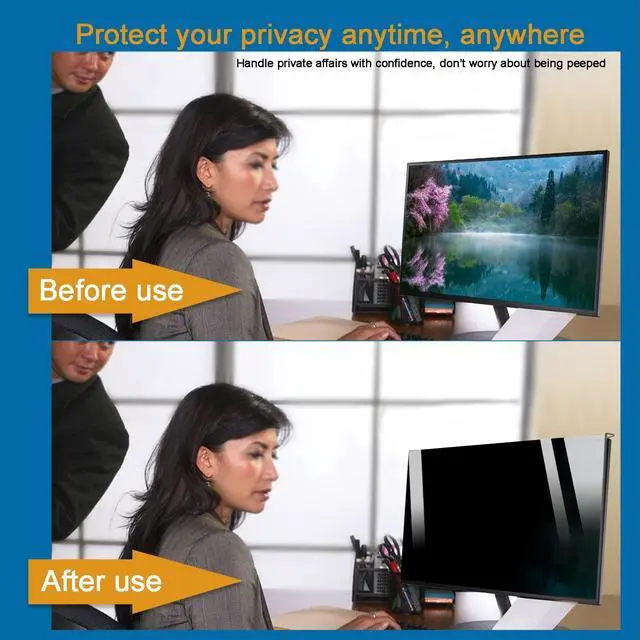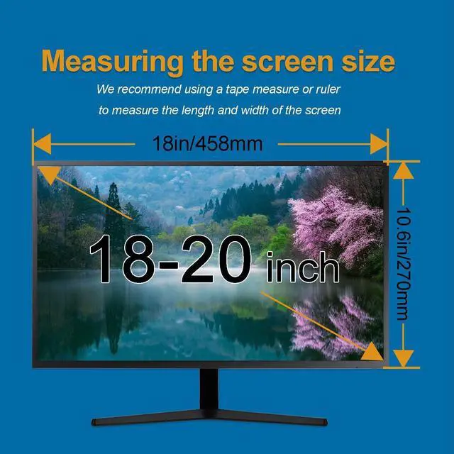 Width: 18 inches (458mm), Height: 10.6 inches (270mm). It Can be easily re-used with multiple monitors and sizes. Contact us if you have any questions about dimensions. ^^ PREMIUM QUALITY - Computer blue light blocking screen filter for eyes protection with acrylic materials with a high resolution reviwe, real colors, scratch resistance, anti-fingerprint, explosion-proof ^^ PRIVACY PROTECTION - The privacy screen for monitor helps achieve this by limiting the viewing angle of your screen to a straight position so only you can see the contents of your screen while people on either side of it only see a darkened screen ^^ EASY TO REMOVE AND INSTALL - It adopts hanging installation, which is very convenient to take and use at any time. It can be used for different monitors at any time, no need to paste, no need to use tools to install ^^ PERFECT FOR TRAVEL AND OPEN WORKSPACES - Our computer screen privacy filter is the ideal solution for healthcare providers, mobile workers, commuters, students, and business travelers. Now you can stay compliant and safeguard sensitive corporate information while working in airplanes, subways, airports and public areas
