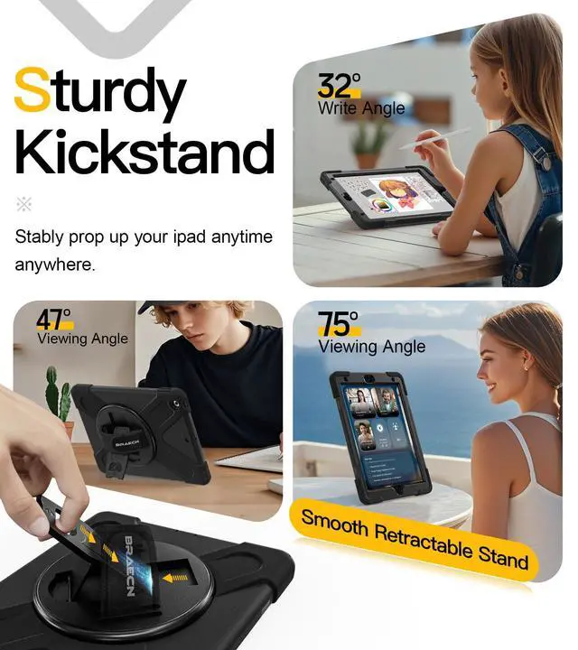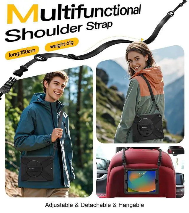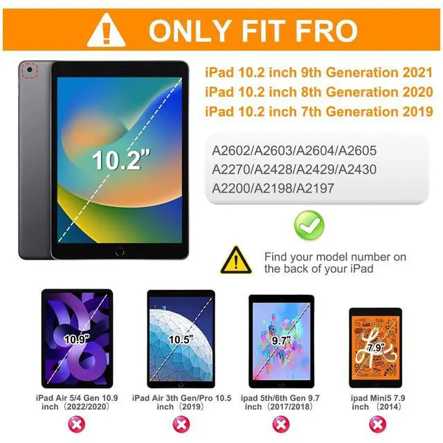 Generation 10.2 '' 2019 (Model: A2197 A2198 A2200), WILL NOT FIT ANY OTHER MODEL. ^^ Full Body ProtectionThe iPad 9th Generation case features a triple-layer design with a built-in clear screen protector, offering comprehensive defense against everyday scratches, impacts, and vibrations. This child-friendly case is the perfect choice for back-to-school season. ^^ 360 Swiveling Stand & Hand StrapLocated on the back of apple iPad 9th/8th/7th generation 10.2 inch case 2021/2020, built-in 360 degree rotating kickstand and adjustable handle hand strap provides a more flexible and convenient way to use your tablet during work, study or journey, ideal for students, teachers, engineers, cashiers and waiters, etc. ^^ Adjustable & Detachable Carrying StrapiPad 9th/8th/7th Gen tablet case with Portable Shoulder Strap allows to carry your iPad 7th Gen in landscape/portrait mode securely in outdoors or hang your iPad in kitchen, bedroom, car seat for convenient usage.
