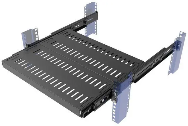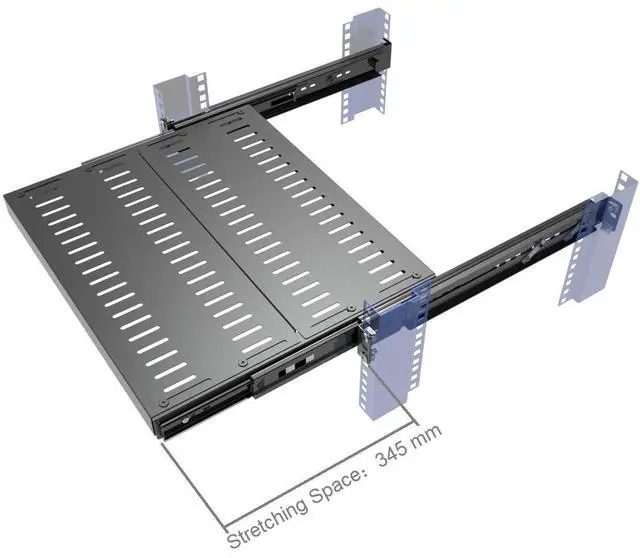 Tray usage space: Width 15.9" x Depth adustable from 14" to 17". Composed of 2 pcs of 7" deep shelves; Max. extension depth when sliding out: 13.5" (345mm); Fitting standard 19-inch width server racks and cabinets, ensuring versatile integration into your existing setup.
