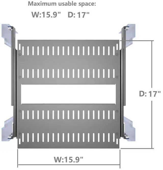 ^^ Adjustable Depth: The installation depth of this sliding frame can be adjusted between 15 inches and 22 inches to accommodate various rack depth. The depth of the tray can be adjusted between 14 inches and 17 inches for storing various equipment sizes.