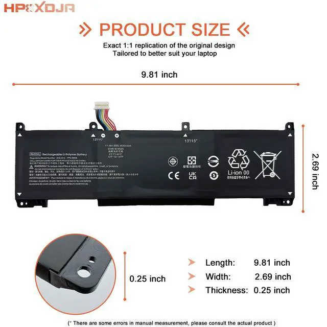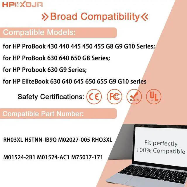 WHAT YOU GET: 1 * RH03XL battery. 1 * User Manual. 4 * Screwdrivers. ^^ Compatible with RH03XL battery. Fit for HP ProBook 430 440 445 450 455 G8 G9 G10 Series; Fit for HP ProBook 630 640 650 G8 Series; Fit for HP Probook 630 G9 Series; Fit for HP EliteBook 630 640 645 650 655 G9 G10 series ^^ Part Number RH03XL HSTNN-IB9Q M02027-005 RHO3XL M01524-2B1 M01524-AC1 M75017-171 ^^ Outstanding quality All HPXXDJA products have passed CE and UL safety certifications. Each battery has the capacity to provide enduring, continual use. Fully Safeguard your laptop and batteries.