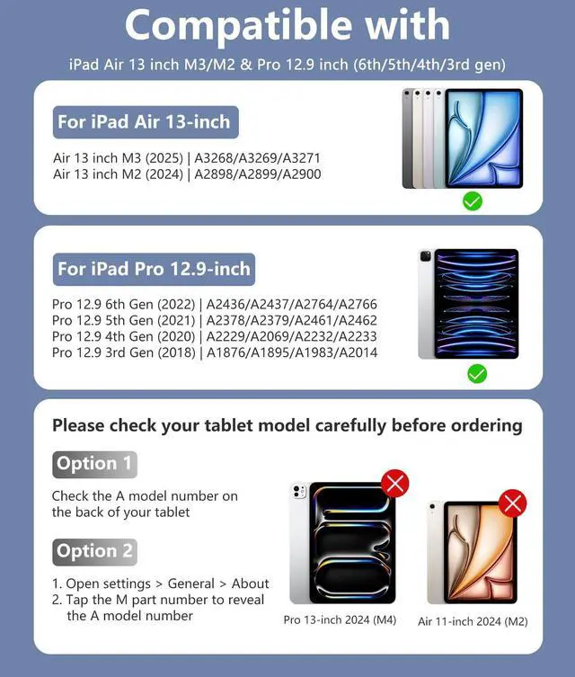 CompatibilityHarvopu Keyboard Case specially for iPad Air 13-inch M3 2025 (A3268/A3269/A3271), for iPad Air 13-inch M2 2024 (A2898/A2899/A2900), for iPad Pro 12.9 inch 6th Gen 2022 (A2436/A2437/A2764/A2766), for Pro 12.9 5th Generation 2021 (A2378/A2379/A2461/A2462), for Pro 12.9 4th Gen 2020 (A2229/A2069/A2232/A2233), for Pro 12.9 inch 3rd Gen 2018 (A1876/A1895/A1983/A2014). please find the No. "AXXXX" before order (Open settings > General > About, Tap the M part reveal the A model number) ^^ Quick and Easy NavigationEnhance your productivity with t he high-sensitive multi-touch touchpad of the Harvopu iPad air 13 inch case keyboard.