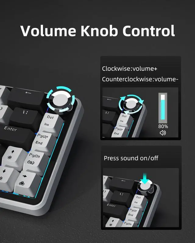 The internal Poron foam effectively absorbs keystroke vibrations and noise, creating a deeper, more satisfying sound. Experience a softer, more cushioned typing feel and a noticeably quieter sound profile, perfect for both gaming and professional use. ^^ Metal Knob & Smart IndicatorsTake control with the high-quality, CNC-machined aluminum volume knob. Adjust your device's volume by rotating the knob or mute the sound with a simple press. This keyboard also includes three indicator lights, giving you an at-a-glance view of your keyboard's status. ^^ Hot-Swappable CustomizationCustomize your keyboard with ease.