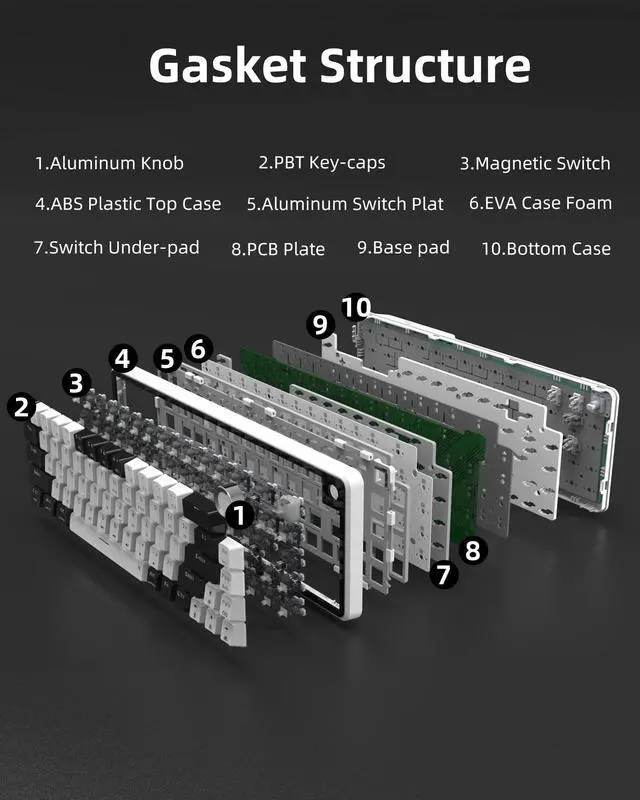 Magnetic Switches8000Hz Polling Rate. Experience ultra responsiveness with fully adjustable actuation points on every keys, customizable from a hair-trigger 0.1 mm for instant in-game actions to a deep 4.0 mm for precise control. Activate Rapid Trigger for the fastest possible response and program Dual-Action keys to execute two commands with a single press. Based on contactless magnetic technology for extreme durability (100M+ keystrokes), this keyboard offers the ultimate in speed, precision, and reliability for serious gamers. ^^ 65% Gasket-Mounted DesignLF67 compact 65% gaming keyboard features an advanced gasket mount structure and five layers of sound-dampening material.