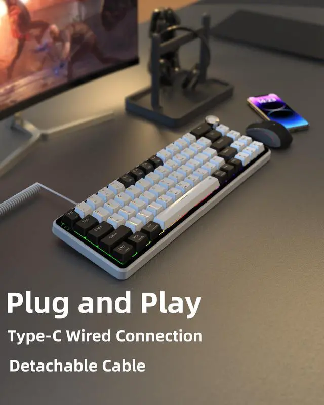 This hot-swappable keyboard is compatible with both 3-pin switches, providing fast and reliable response for intense gaming. ^^ Dynamic RGB & Customizd DriverChoose from over 20 built-in RGB lighting modes, including various dynamic, monochrome, and full-color effects. You can also use the software to customize your own unique lighting modes and colors. For ultimate control, this keyboard supports customizd driver, allowing you to easily remap keys, create macros, and fully personalize your layout. ^^ Double-shot PBT KeycapsThe PBT keycaps are made with durable double-shot technology. Their matte finish provides a superior tactile feel while ensuring the legends are clear, non-fading, and highly resistant to wear.