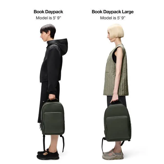 WATERPROOF: Book Daypack is a waterproof bag offering a minimal silhouette in campus-ready proportions. The design is characterized by its curved top, sharp base, and large front zip pocket. Opening the main coated zip reveals a spacious main compartment, which includes, a padded laptop sleeve for devices up to 14 to 16".