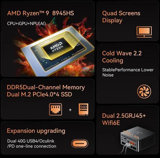In terms of storage, it provides two M. 2 2280 PCIe 4.0 SSD slots, supports rapid removal, and can be expanded up to 8 TB, facilitating rapid upgrading and replacement. ^^ Quad-Screen DisplayUM890 Pro mini pc 8945HS is equipped with HDMI 2.1, DP 1.4, and 2 x USB4, supporting maximum resolution of 8K at 60Hz/4K at 144Hz, providing a variety of video output options and with more flexible and efficient work space. ^^ Various Peripheral InterfacesIncluding 2 x 45.2G RJ5 Ethernet ports, 1 x Oculink port, 4 x USB 3.2 Gen2 Type-A ports, 2 x USB4 ports (supports Alt PD, 65-100W PD input, 15W PD output), 1 HDMI 2.1, 1 DP 1.4, 1 audio jack, 1 DMIC, 1 Clear CMOS button, providing comprehensive connection options to meet various peripheral needs.