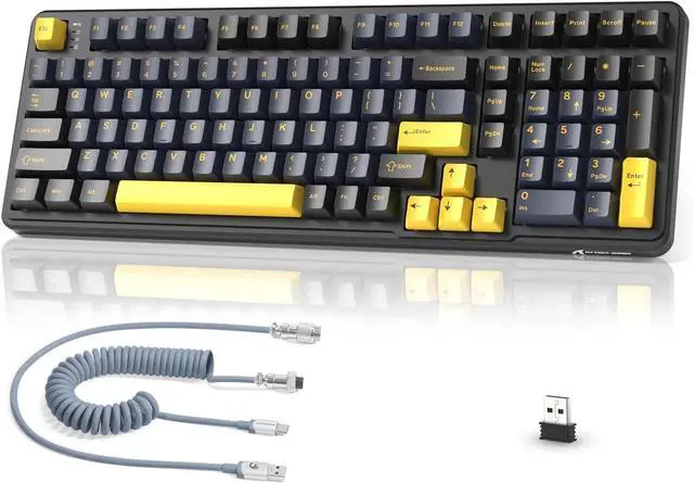 The high-quality PBT keycaps are oil-resistant and long-lasting, available in stylish three-tone color schemes or a trendy gradient design with side-printed legends. The 98-key compact layout offers all the functionality of a full-size 104-key keyboard in a space-saving 87-key frame, making it highly portable. ^^ Ultra-Low Latency Chip & Essential AccessoriesThe built-in 4000mAh rechargeable battery ensures long-lasting performance on a single charge. A high-performance low-latency chip delivers smooth, responsive operation for gaming and productivity. Includes a 1.5 m Type-C cable with a magnetic ring for stable transmission, a steel wire keycap and switch puller, and two extra switches for customization.