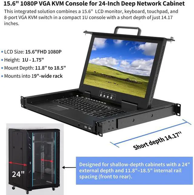 The 1U Rack Mount KVM console is specifically designed for modern, space-constrained 24-inch deep server racks. This integrated solution combines a 15.6 -inch Full HD monitor, a full keyboard with touchpad, and an advanced 8-port VGA KVM switch in a compact 1U form factor. Its shallow-depth design makes this 8 Port Rack Mount KVM console an ideal choice for network cabinets, 5G infrastructure, and data centers where rack space is at a premium, providing comprehensive server management capabilities. ^^ Effortlessly control up to 8 computers from this single, centralized station.