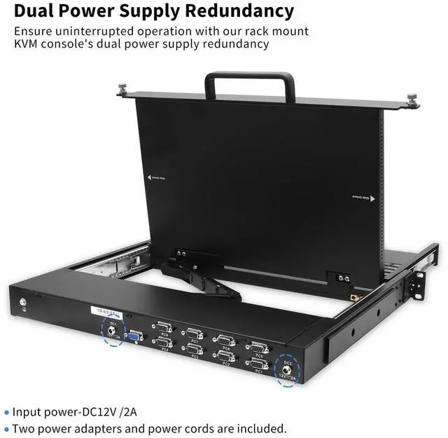 This 8 Port Rack Mount KVM console delivers a complete desktop experience directly from your server rack, eliminating the need for external peripherals. ^^ For enhanced operational flexibility, this rackmount KVM console includes two front-accessible USB ports for connecting additional peripherals such as external keyboards or diagnostic tools. The dual power supply redundancy design ensures continuous operation, while hot-pluggable capability allows for server connections and disconnections without system downtime, making maintenance tasks straightforward and efficient. ^^ Built to withstand demanding server room environments, this LCD KVM console features a heavy-duty steel construction with protective coating and robust metal sliding rails.